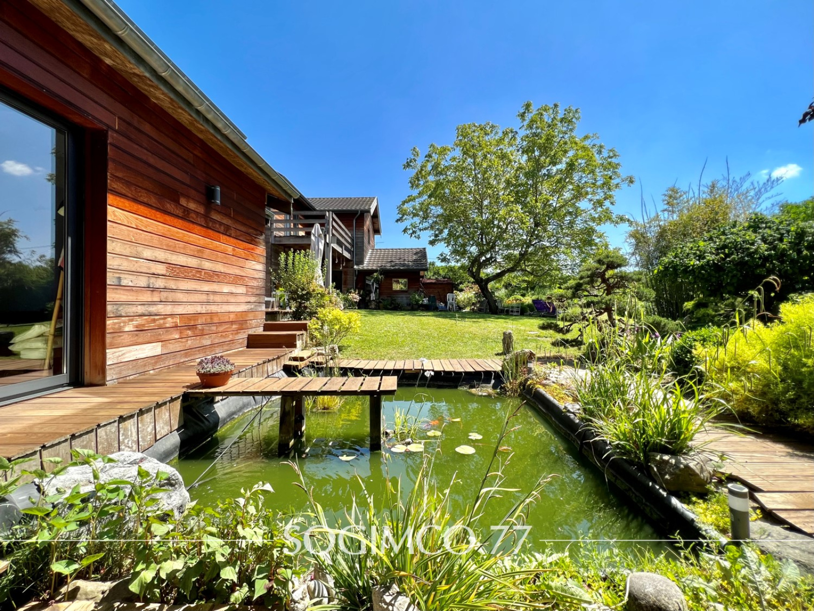 En extérieur, un jardin paysager d’environ 1000 m² sans aucun vis-à-vis avec son bassin situé devant la chambre parentale offre un espace convivial et paisible. Une cour de 250 m² vous permet de stationner plusieurs véhicules.